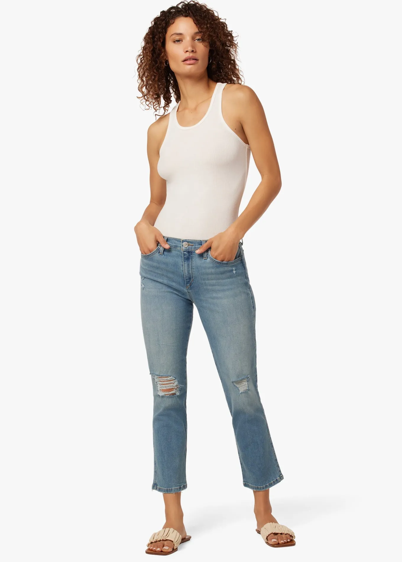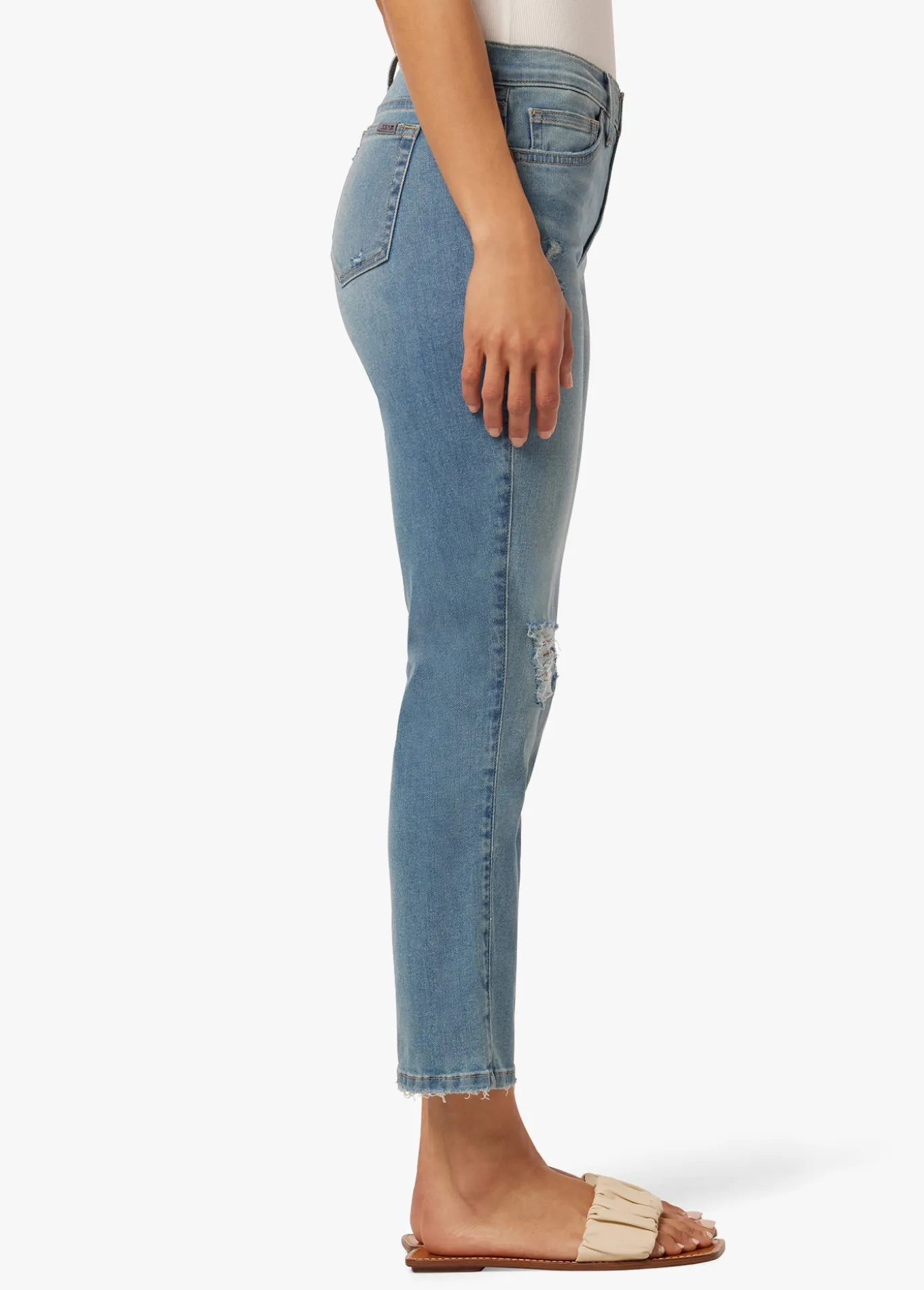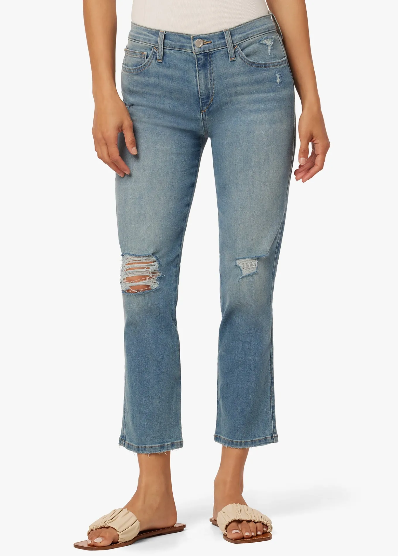 These mid-rise, straight jeans offer just right amount of comfort–not too fitted, not too loose. The cropped length is ideal for kicking around and the slight destruction makes these jeans look like they've lived in your closet forever. 74% Cotton, 25% Polyester, 1% ElastaneMODEL IS WEARING SIZE 26