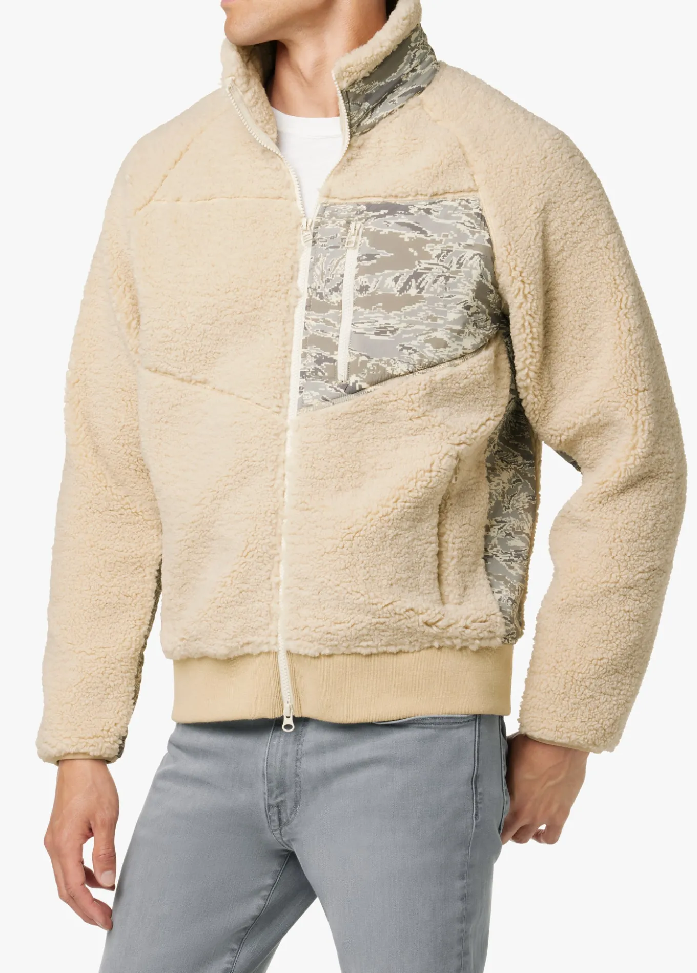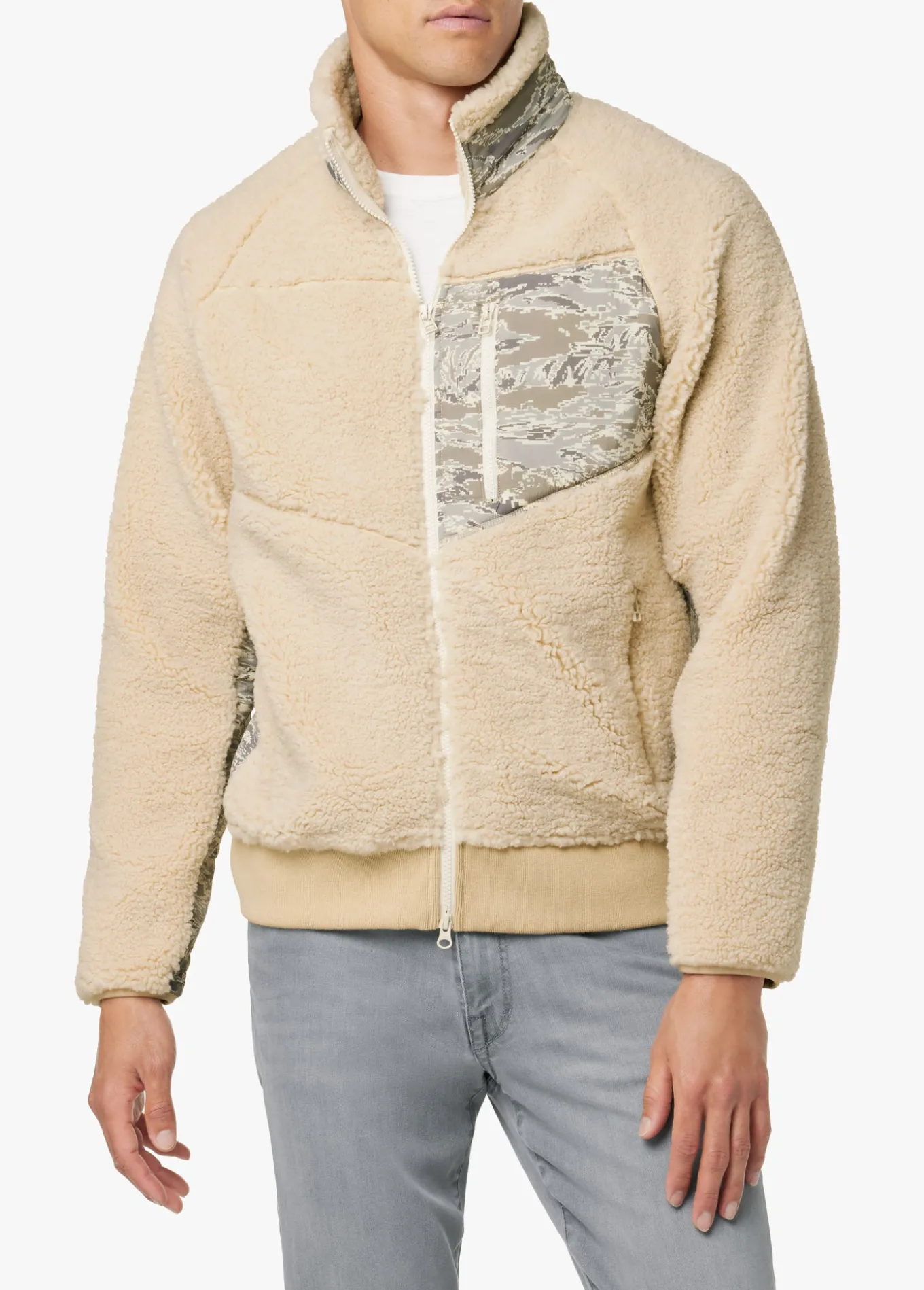 When it comes to layering, there's nothing cozier than a sherpa jacket like this one here. Woven nylon piecing punches up the contrast, and there's ample pocket space for stashing your essentials. Detailed with reflective zipper pulls, neutral camo accents and lined with basketball mesh–it's a modern, street-ready tak
