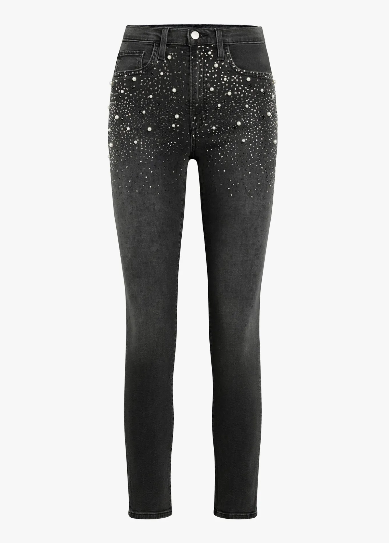 In our latest collaboration with jewelry designer and influencer Stephanie Gottlieb, she marries denim and diamonds with the timeless touch of pearls. Done in supersoft black denim that’s been washed down for a slightly faded look, these high-rise, cigarette jeans are accessorized with sparkle across the front for a pu