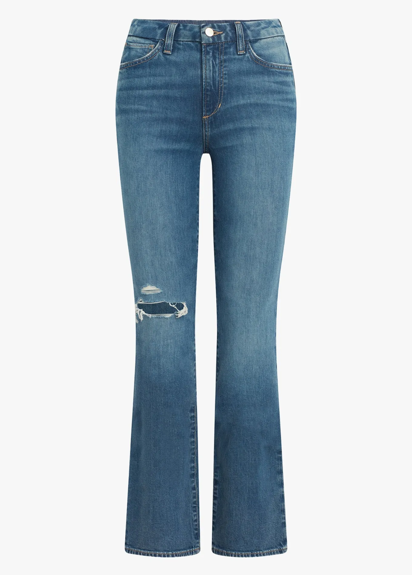 The Hi Honey Bootcut in 'Hang In There' is a high-rise curvy-fit jean made from comfortable denim designed especially for hourglass silhouettes. This sustainable medium wash has hand sanding, destruction at the knee and top block whiskering which makes for a timeless, yet lived-in look.10 1/4; RISE34; INSEAM62% Cotton,