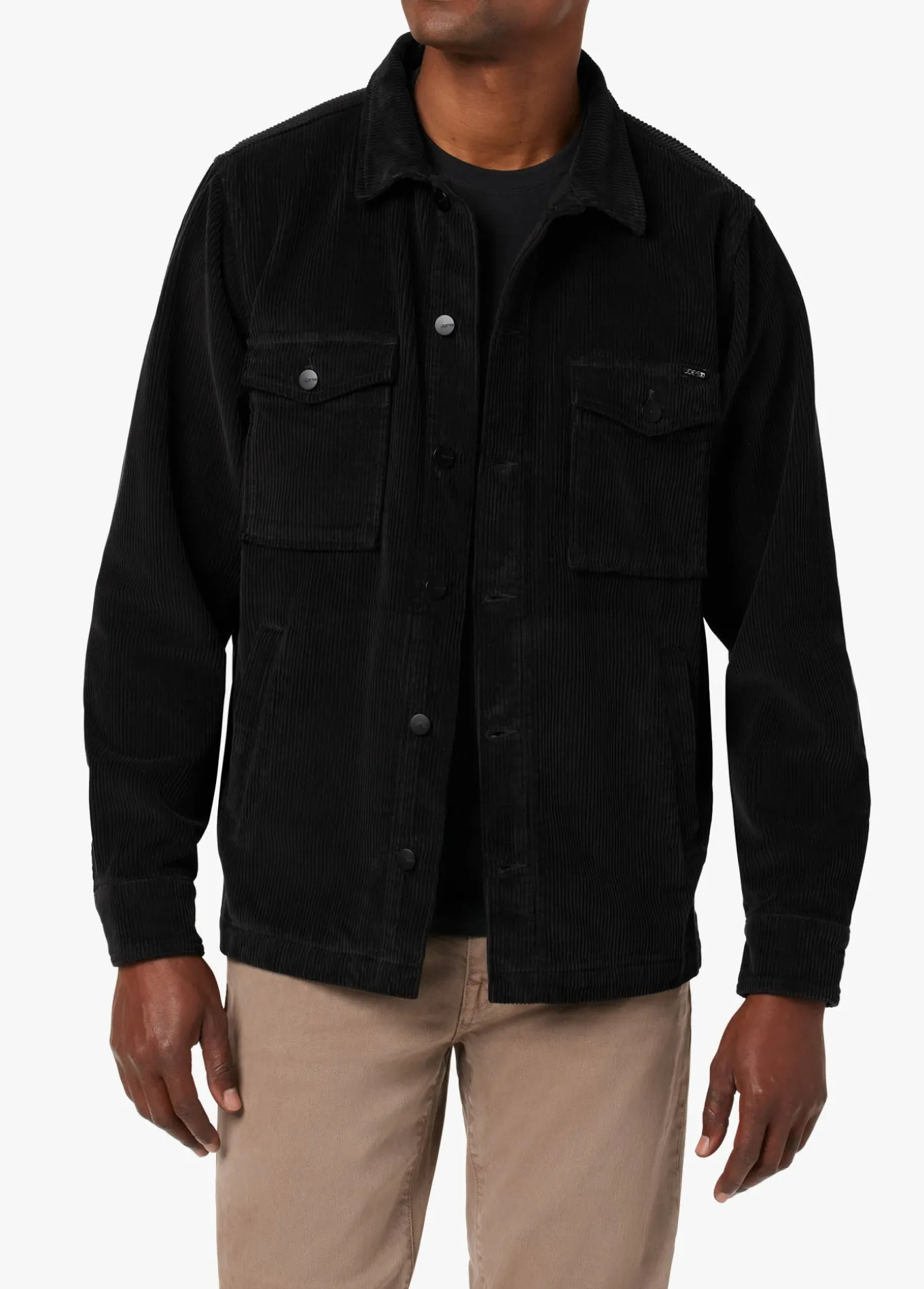Cut in black cotton corduory, the Flynn Shirt Jacke is the perfect button up for when you want to layer up. It's styled with oversized front pockets and a pointed collar–and because it's not bulky, it looks just as great unbuttoned as a top layer or buttoned up. 100% COTTON MODEL IS WEARING SIZE M